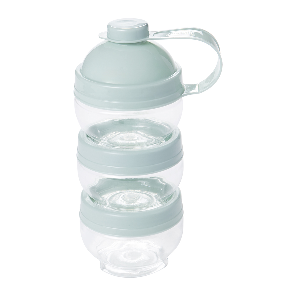 Cada potinho tem 155 ml, que é aproximadamente 60 gramas de leite em pó, ao total tendo capacidade para 180 gramas de leite em pó. Ele é seguro, pois tem um encaixe e um travamento perfeito, basta colocar um em cima do outro e girar que ele trava, e a tampa é de rosca. Possui um bico dosador, que evita desperdícios e sujeira.